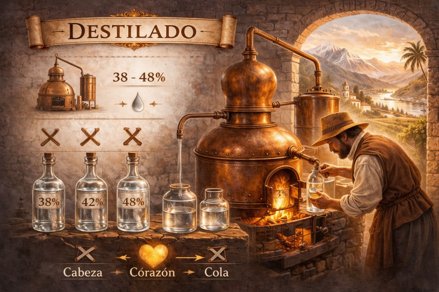 Luego llega el momento clave: la destilación. El vino se lleva a alambiques — tradicionalmente de cobre— y se destila una sola vez, directamente hasta el grado final de consumo, normalmente entre 38 y 48% de alcohol. No hay segunda oportunidad. No hay correcciones posteriores. No se diluye con agua. El destilador decide en tiempo real los cortes de cabeza y cola, seleccionando únicamente el corazón más limpio y expresivo.