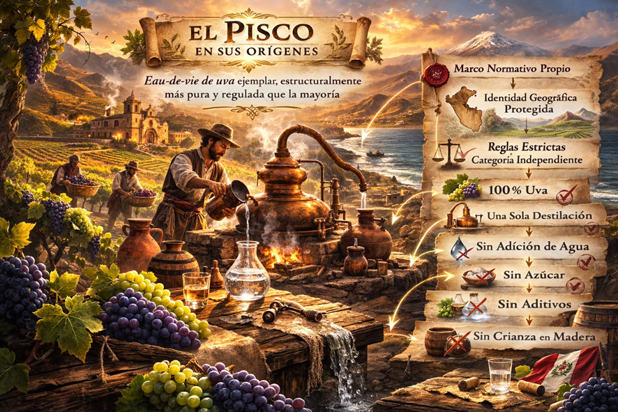 El Pisco es una eau-de-vie de uva ejemplar, estructuralmente más pura y regulada que la mayoría con una diferencia fundamental: