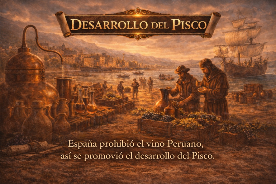 Para la década de 1590, la Corona española prohíbe la importación de vinos procedentes de América. La medida afecta directamente al Virreinato del Perú, cuya costa sur peruana es la principal zona productora de vinos del virreinato y así comienza a enfrentar importantes excedentes. Para evitar pérdidas y encontrar una salida legal, esos vinos empiezan a destilarse. El vino estaba prohibido; el destilado, no. Así se inicia la exportación de aguardiente de uva hacia España. Y es cuando ocurre algo decisivo: no se busca corregir la bebida, sino revelar la uva. Se destila una sola vez. No se agrega agua. No se endulza. No se disfraza. Lo que sale del alambique es el producto final: la expresión más pura de la uva convertida en licor. Ese principio sigue vigente hoy, casi cinco siglos después.