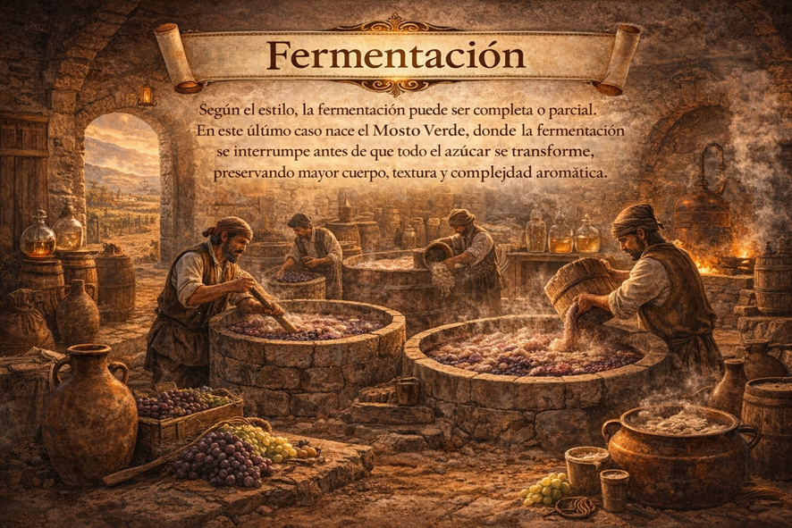 Según el estilo, la fermentación puede ser completa o parcial. En este último caso nace el Mosto Verde, donde la fermentación se interrumpe antes de que todo el azúcar se transforme, preservando mayor cuerpo, textura y complejidad aromática.