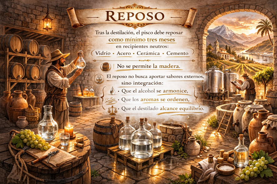 Tras la destilación, el pisco debe reposar como mínimo tres meses en recipientes neutros: vidrio, acero, cerámica o cemento. No se permite la madera. El reposo no busca aportar sabores externos, sino integración: que el alcohol se armonice, que los aromas se ordenen, que el destilado alcance equilibrio.